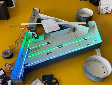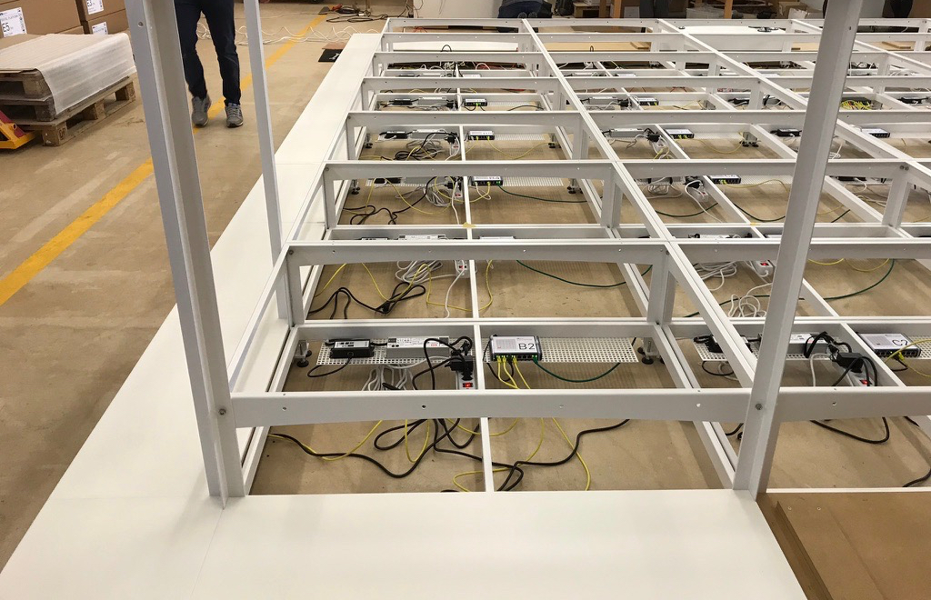 In total 70 OpenWrt Linux devices based on the Omega2S SoC module control the illumination in the 35 glass floor elements, the 18 elements of the 19m long scrolling RGB LED display as well as the