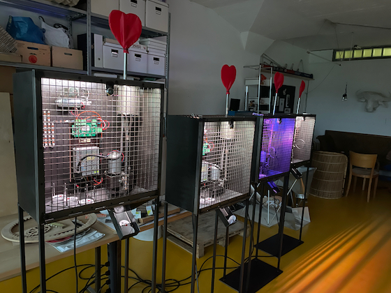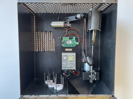Herzchenmaschine für Die Zürcher Mittelschulen. The machine, concepted by hoppingmad gmbh and designed by Martin Fischer / a-Faire, has a swiveling crane with a suction nozzle that allows students to fish for a heart sticker with their smartphone and deliver it to the ejector. The controller consists of a P44-AC-DCM controller mounted without a housing for visual reasons; the control software is just 400 lines of p44Script (for those interested: here's the source code). The installation is completely offline (no internet connection, no cloud) and does not collect any data.
