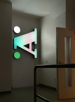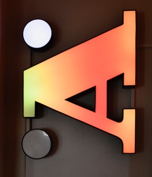 "Wetterbuchstabe" at gleis70.ch. A competition was held for projects to recycle the old illuminated letters that were installed on the building in the 60's. plan44.ch turned an "Ä" into an LED installation that uses color moods to reflect the current weather. A P44-LC-LED controller is connected to a weather station via LAN and also retrieves weather data from the Internet. From this data, different color moods and animations are generated.