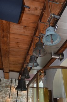 glocken2: Custom electronic clock driving real antique bells installed in various restaurants of Bindella Terra Vite Vita. With BLE remote control for test and setup. Mechanics and design of bell mounts by a-faire and Schwitters Raum, electronics and software by plan44.ch. Photos shows the bell installation in Gerberstube Schaffhausen.