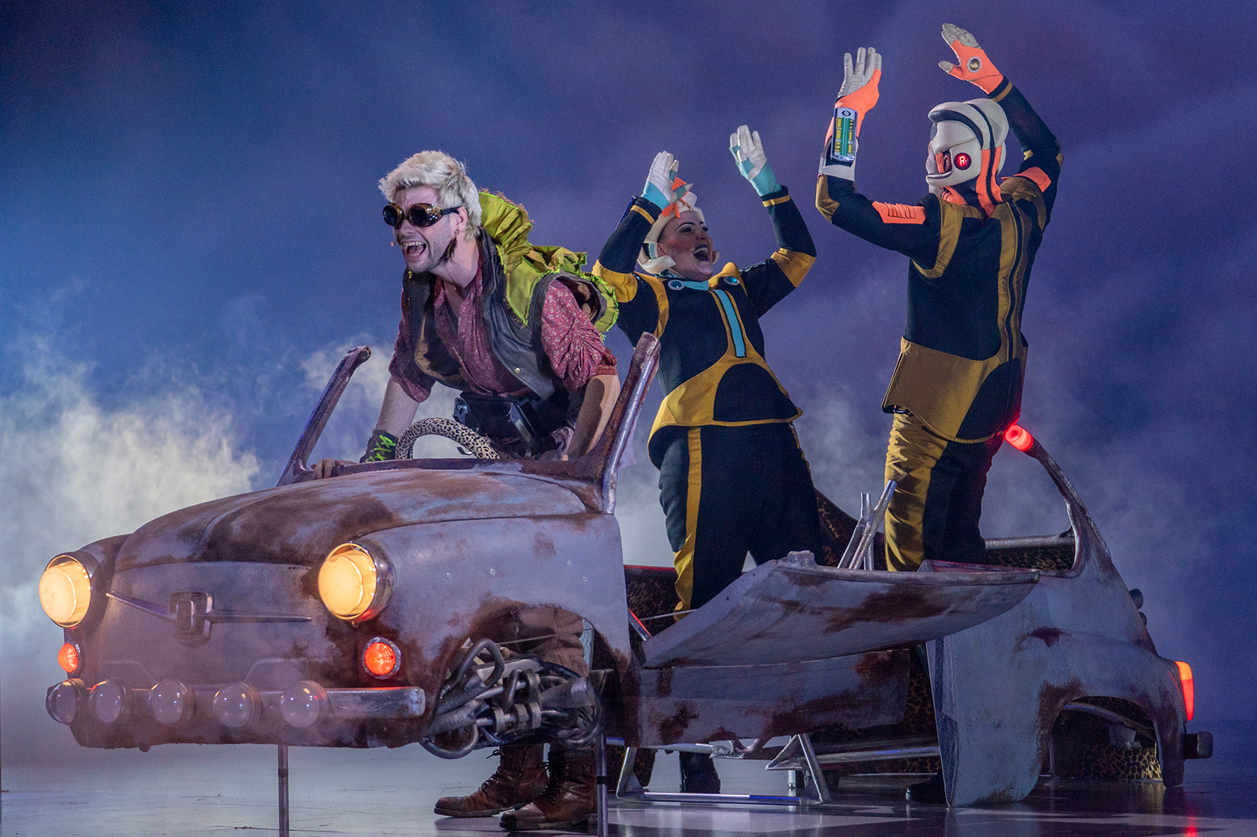 Mobile LED effects on costumes and props for the Musical Space Dream. For this show, 30 low-cost, ESP32-based Bluetooth controllers were developed and integrated into the DMX lighting control system for the entire show via the p44BTDMX protocol. The p44BTDMX project is completely open source on github, the p44BTDMX iOS app for testing or small installations without a DMX lighting console is available on the App Store (source also on github).